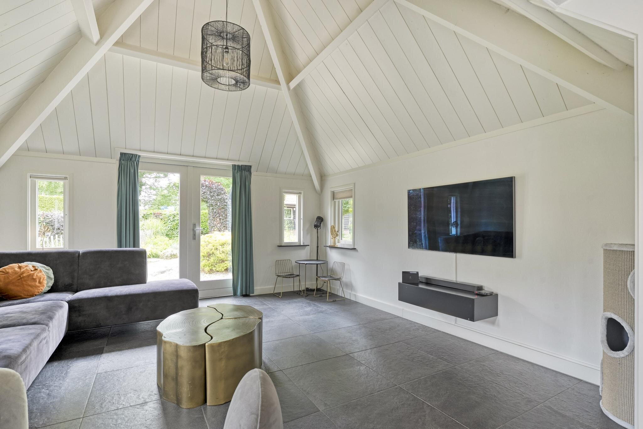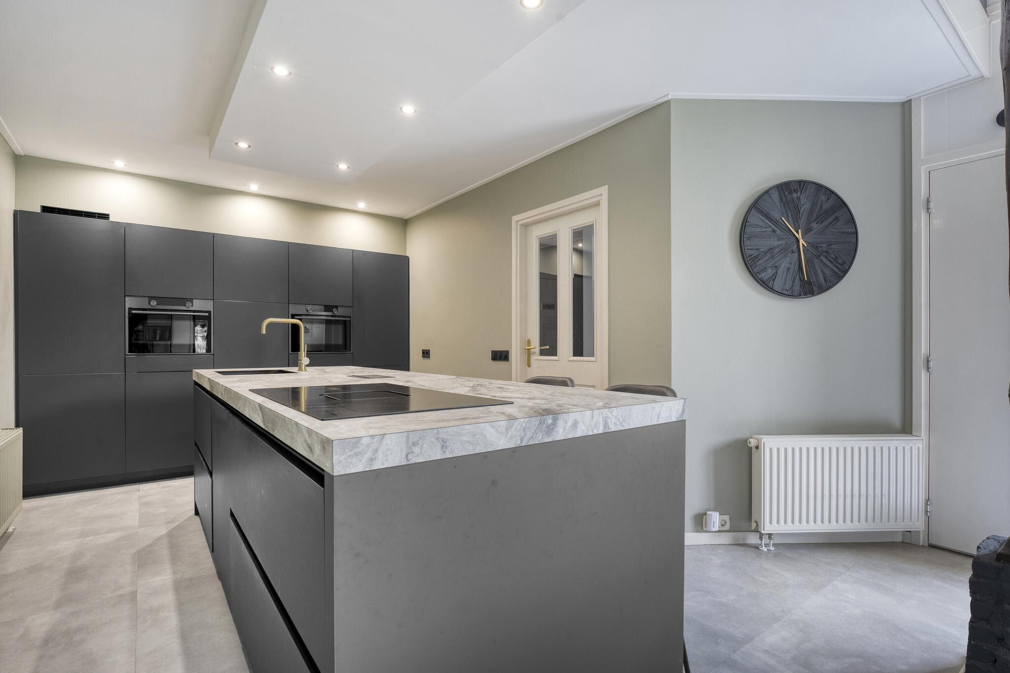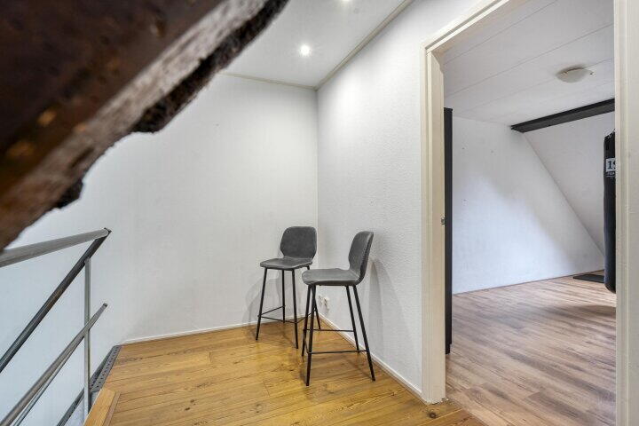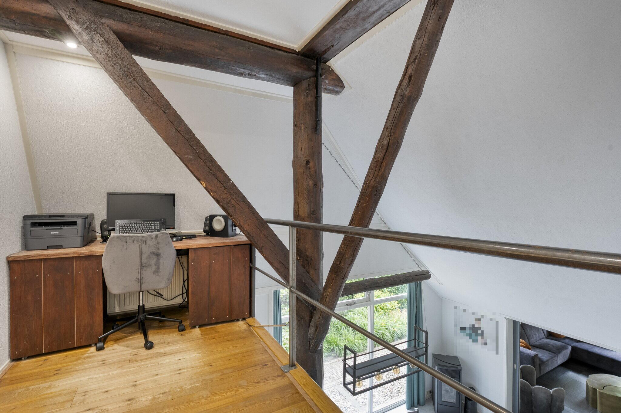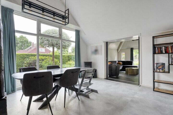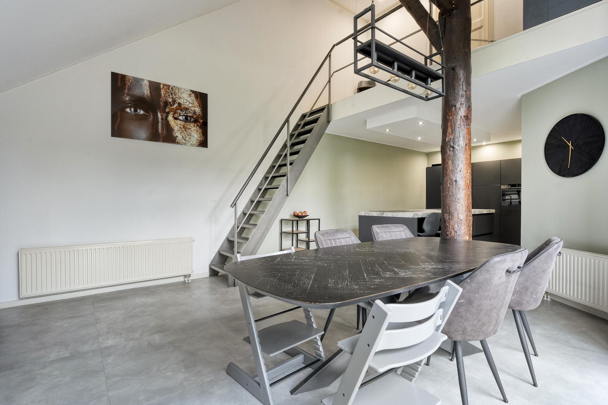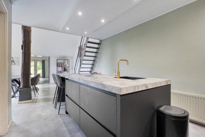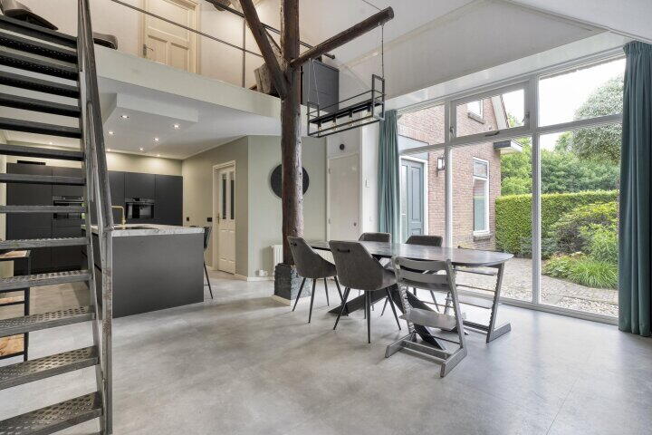 Vanuit de hal bereikt u de ruime woonkeuken met eetkamer en authentieke oude gebinten. Er is een rechte stalen trap naar vide met werkplek en achtergelegen slaapkamer. De in 2022 geplaatste inbouwkeuken is voorzien van koelkast, vaatwasser, dubbele combioven en inductiekookplaat in het kookeiland. Via de "En-suite deuren" is de (in 2007 gebouwde) knusse zitkamer met openslaande deuren naar tuin bereikbaar.
